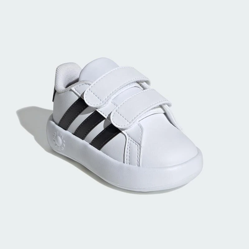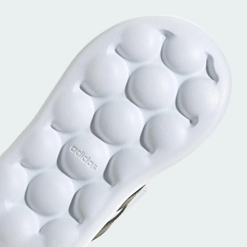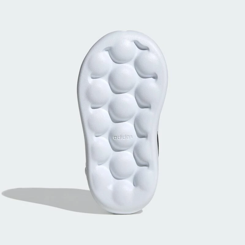 Une chaussure bébés avec une semelle mouchetée, conçue en partie avec des matières recyclées.
