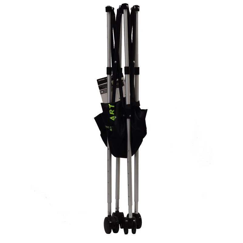 Il a un encombrement réduit une fois plié (longueur : 1 m, largeur : 20 cm)et il est vendu avec une housse textile de rangement et transport.