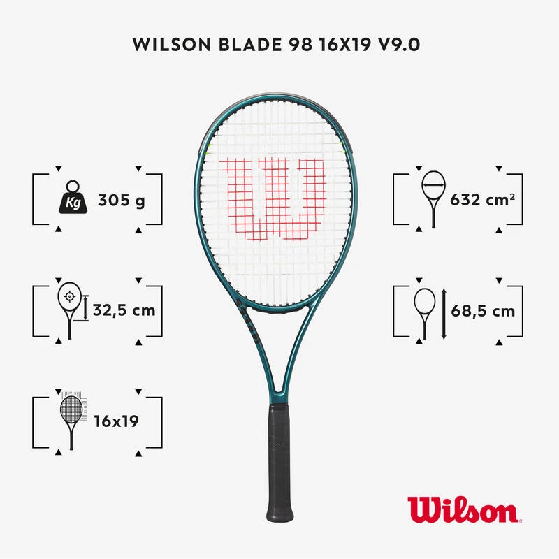 Cette raquette est conçue pour les joueurs et joueuses de tennis experts à la recherche d’une raquette précise et stable. Raquette vendue non cordée.La Wilson Blade 98 16×19 V9 est un concentré de contrôle et de stabilité. Son petit tamis de 632cm² et le « 45 LAY UP TECHNOLOGY » apportent une précision extrême !