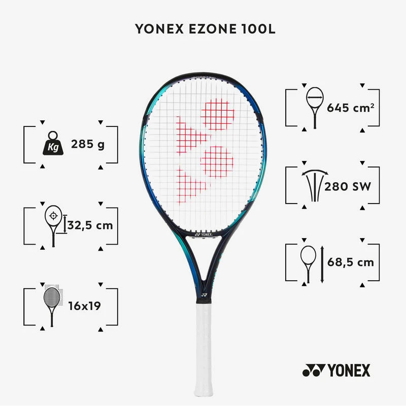 Cette raquette est conçue pour les joueurs et joueuses de tennis experts à la recherche de puissance et de maniabilité. Raquette vendue non cordée.La Yonex EZONE 100L 7ème génération est une raquette toujours aussi puissante et maniable. Sa forme de cadre « ISOMETRIC », signature des raquettes Yonex, garantit également un bon contrôle.
