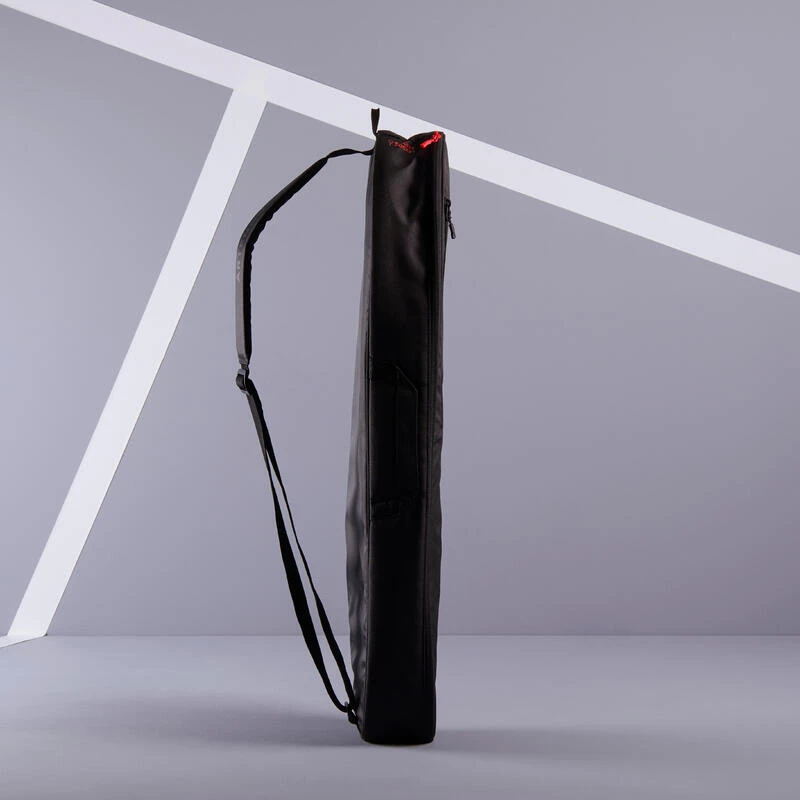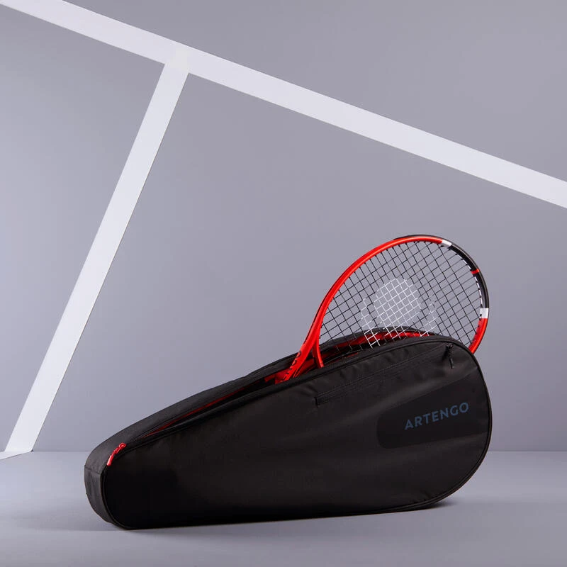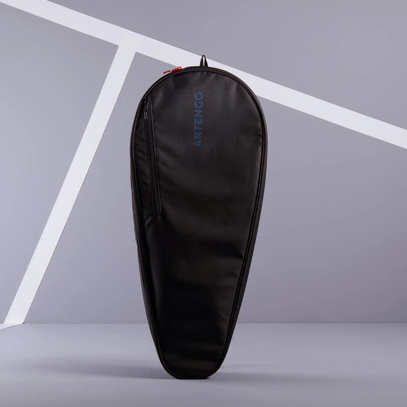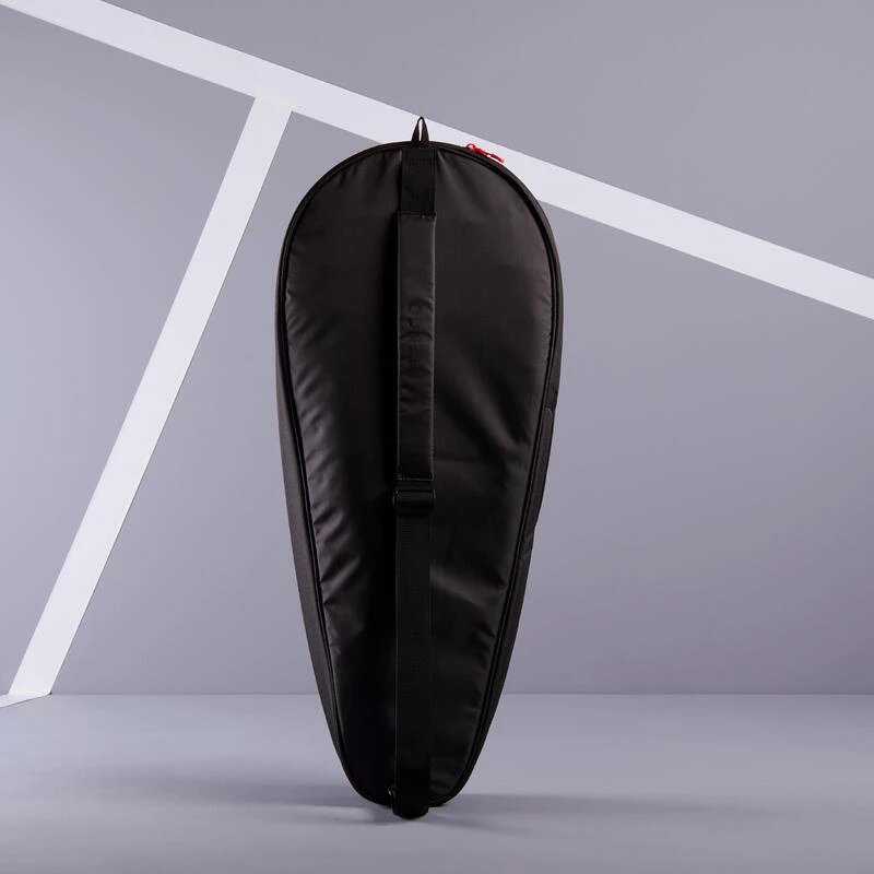 Ce sac de tennis Artengo 100 M en forme de housse possède une bandoulière qui permet de le porter dans le dos (pratique à vélo), ainsi qu’une poignée pour le porter comme une valise.